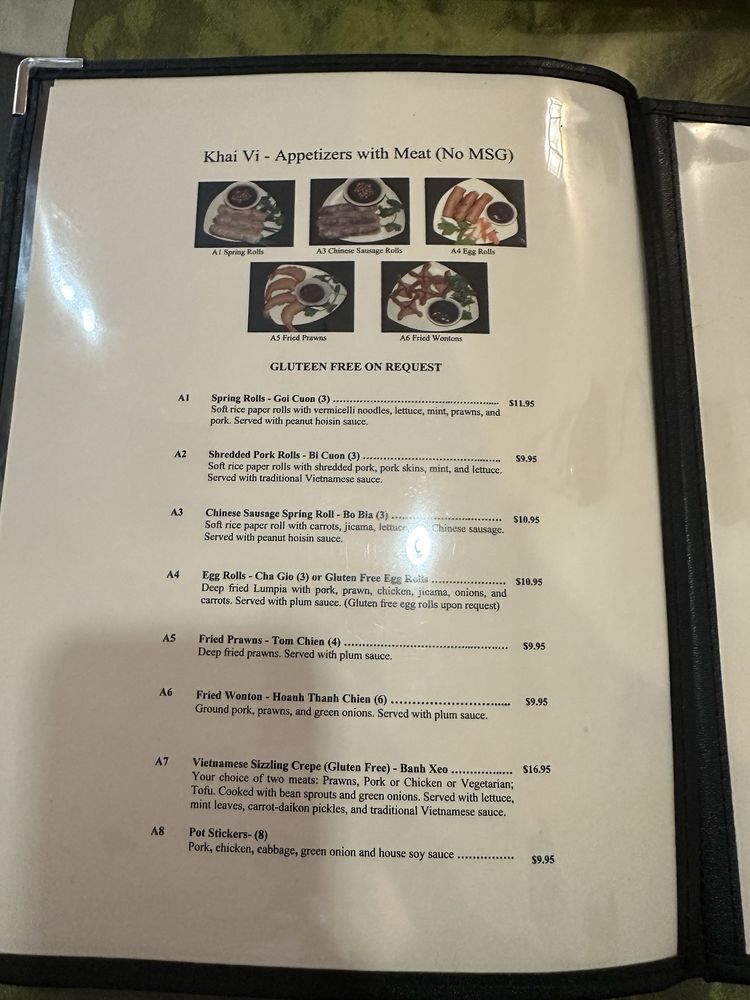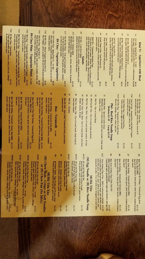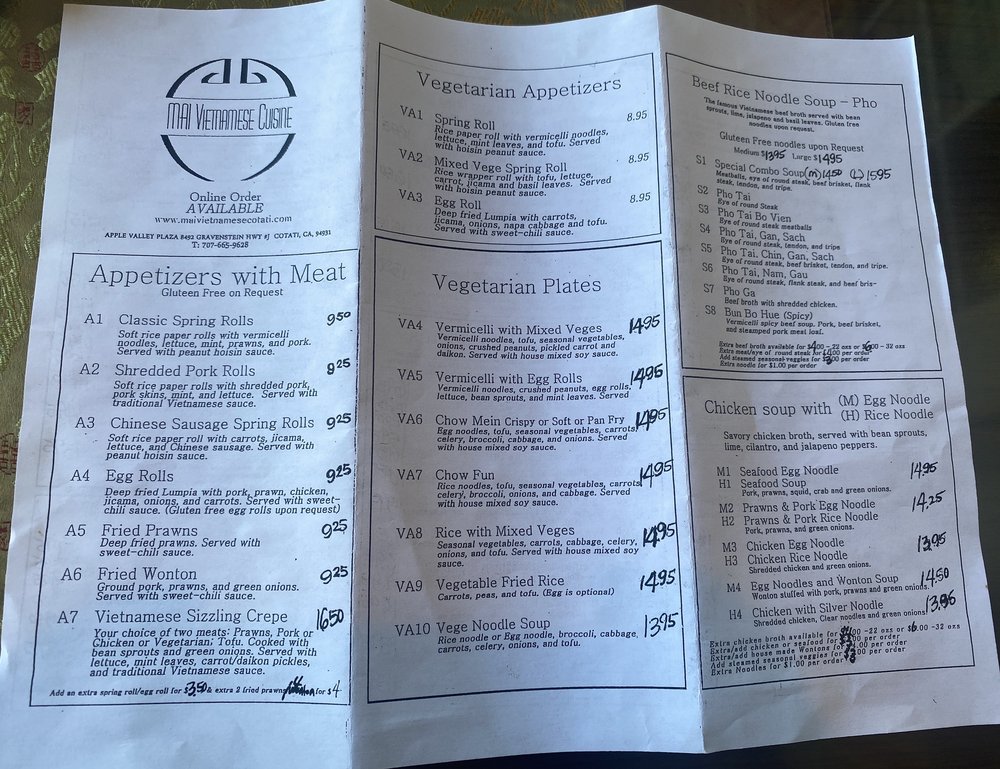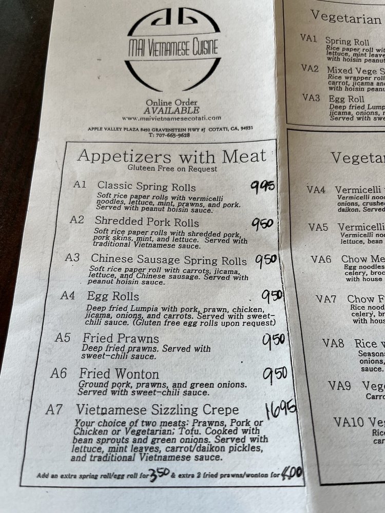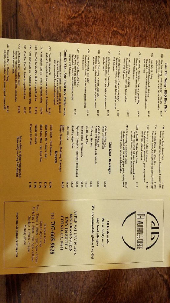 Introducing the menu at Mai Vietnamese Cuisine, located in Cotati, CA, promises a delightful culinary experience. With a variety of Vietnamese dishes like spring rolls, vermicelli noodles, and egg rolls, the menu caters to both meat lovers and vegetarians. The restaurant offers vegan and vegetarian options, making it a versatile choice for all dietary preferences. Customers have raved about the authenticity and flavor of the dishes, with favorites like Bun Bo Hue, BBQ pork, and shrimp receiving high praise. The cozy atmosphere, friendly staff, and reasonable prices make Mai Vietnamese Cuisine a top choice for lunch or dinner. Whether you're craving a hot bowl of pho or a refreshing avocado shake, Mai Vietnamese Cuisine is sure to satisfy your taste buds. With a focus on quality ingredients and excellent customer service, this restaurant is a must-visit for Vietnamese food enthusiasts.
